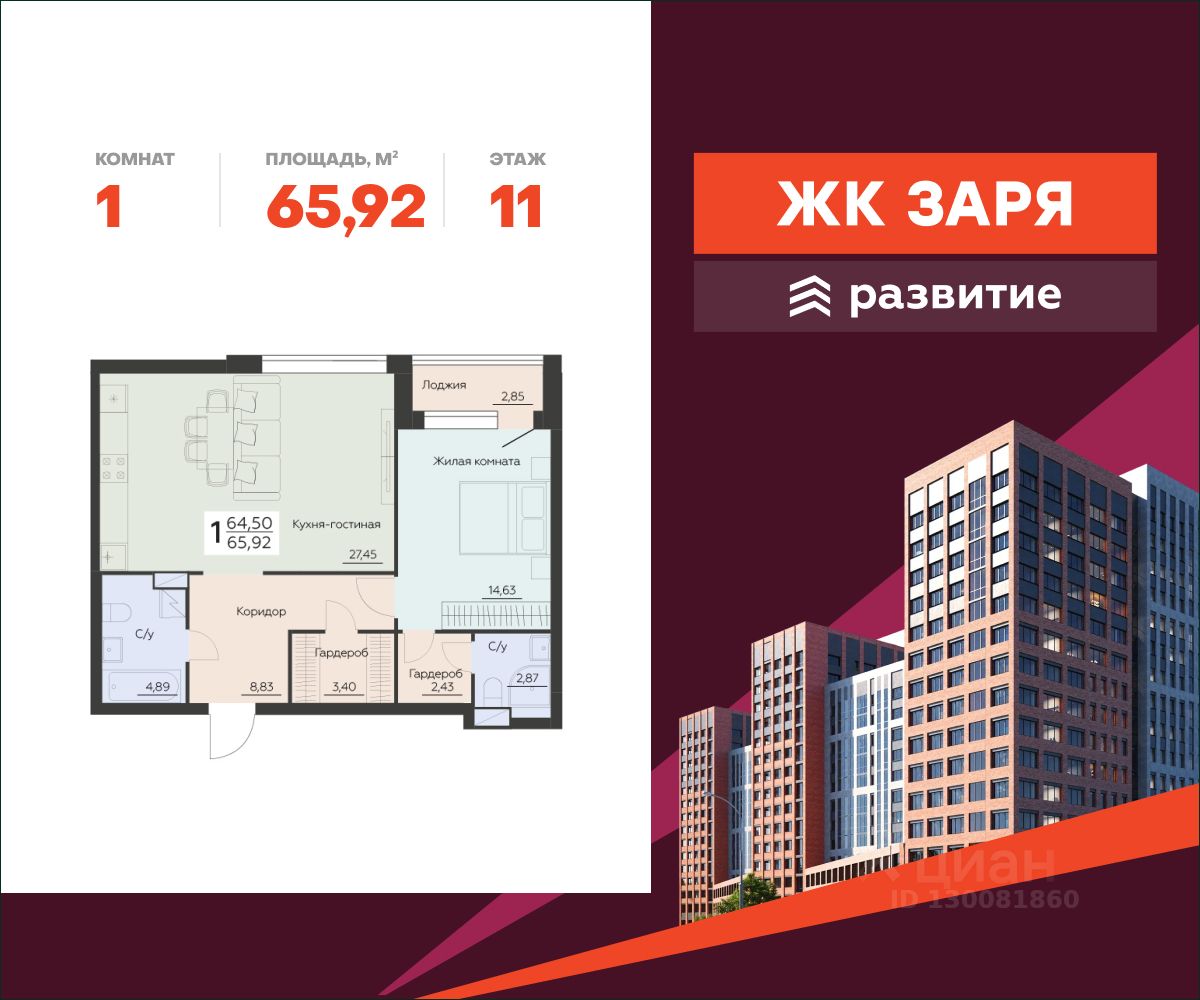 В продаже квартира площадью 65.92 кв. м с черновой отделкой. Квартира расположена на 11 этаже 16 этажного дома, в новом жилом комплексе "Заря" от федерального застройщика "Развитие".
