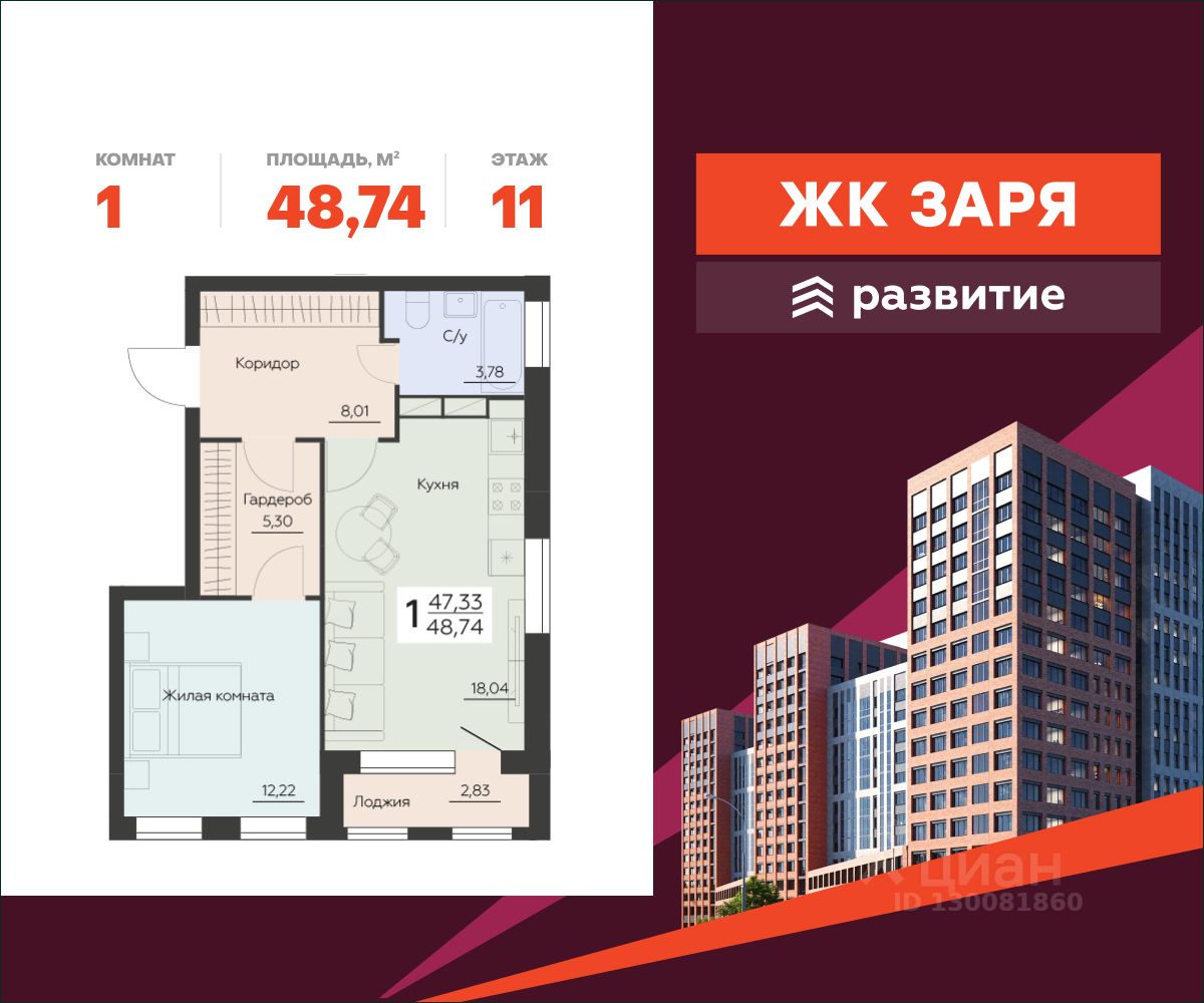 В продаже квартира площадью 48.74 кв. м с черновой отделкой. Квартира расположена на 11 этаже 16 этажного дома, в новом жилом комплексе "Заря" от федерального застройщика "Развитие".