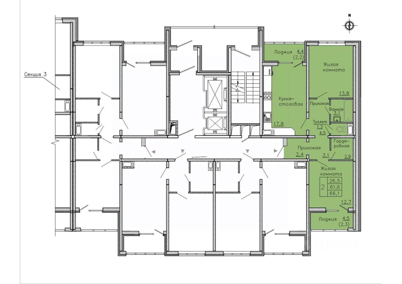 Кухня-гостиная, Спальни на разные стороны, Гардеробная, Лоджия из кухни.