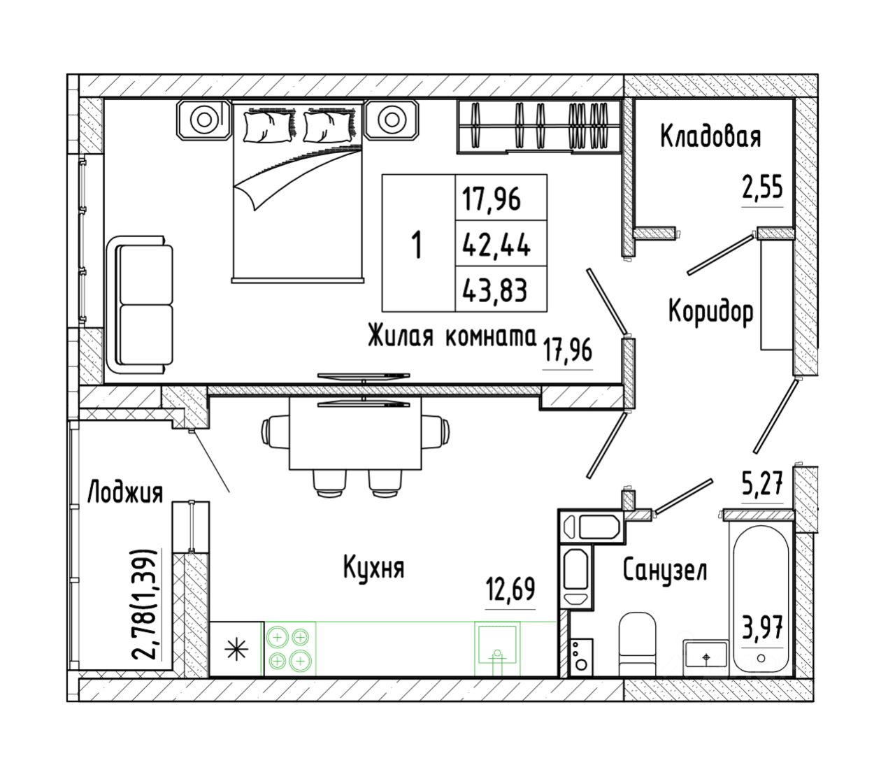 Общая площадь43,83 м²