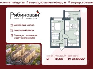 Жилой дом комфорт-класса в Богучаре Комплекс состоит из двух кирпичных домов комфорт-класса. Закрытая дворовая территория обеспечивает безопасное пространство для отдыха детей и взрослых. Безбарьерная среда во дворе и местах общего пользования обеспечивает удобство для пожилых людей и родителей с колясками. Помещения для колясок, велосипедов и спорт-инвентаря в каждом подъезде. Дизайнерский ремонт мест общего пользования. Улучшенная базовая отделка квартир с полу-сухой стяжкой, гипсовой штукатуркой и разводкой электричества. Функциональные планировки - эффективно используется площадь квартиры, просторные кухни и гостиные, ниши под шкафы, предусмотрены гардеробные и постирочные комнаты. Адрес: город Богучар (Воронежская область) Высота: 9 этажей Квартиры: 186 квартир в первой очереди Материал: кирпич Площадь: 9 779 кв.м жилья в первой очереди