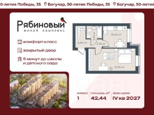 Жилой дом комфорт-класса в Богучаре Комплекс состоит из двух кирпичных домов комфорт-класса. Закрытая дворовая территория обеспечивает безопасное пространство для отдыха детей и взрослых. Безбарьерная среда во дворе и местах общего пользования обеспечивает удобство для пожилых людей и родителей с колясками. Помещения для колясок, велосипедов и спорт-инвентаря в каждом подъезде. Дизайнерский ремонт мест общего пользования. Улучшенная базовая отделка квартир с полу-сухой стяжкой, гипсовой штукатуркой и разводкой электричества. Функциональные планировки - эффективно используется площадь квартиры, просторные кухни и гостиные, ниши под шкафы, предусмотрены гардеробные и постирочные комнаты. Адрес: город Богучар (Воронежская область) Высота: 9 этажей Квартиры: 186 квартир в первой очереди Материал: кирпич Площадь: 9 779 кв.м жилья в первой очереди