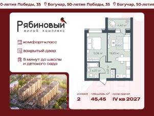 Жилой дом комфорт-класса в Богучаре Комплекс состоит из двух кирпичных домов комфорт-класса. Закрытая дворовая территория обеспечивает безопасное пространство для отдыха детей и взрослых. Безбарьерная среда во дворе и местах общего пользования обеспечивает удобство для пожилых людей и родителей с колясками. Помещения для колясок, велосипедов и спорт-инвентаря в каждом подъезде. Дизайнерский ремонт мест общего пользования. Улучшенная базовая отделка квартир с полу-сухой стяжкой, гипсовой штукатуркой и разводкой электричества. Функциональные планировки - эффективно используется площадь квартиры, просторные кухни и гостиные, ниши под шкафы, предусмотрены гардеробные и постирочные комнаты. Адрес: город Богучар (Воронежская область) Высота: 9 этажей Квартиры: 186 квартир в первой очереди Материал: кирпич Площадь: 9 779 кв.м жилья в первой очереди