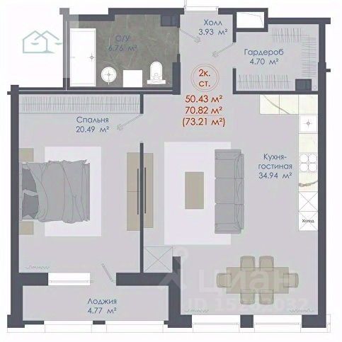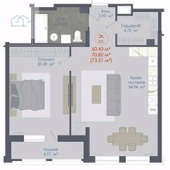 Просторная квартира общей площадью 73 квадратных метра состоит из большой кухни-гостиной 29 квадратных метра, отдельной комнаты 20 кв.м., совмещенного санузла и кладовки. Очень большая застекленная лоджия - почти 5 квадратных метров! Окна выходят во двор, на южную сторону.