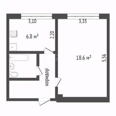 При входе в квартиру вас встречает просторный коридор, который ведет в светлую комнату. Комната площадью 18 м² оборудована большими окнами, что обеспечивает отличное естественное освещение на протяжении всего дня. Здесь достаточно места для размещения спальни и зоны отдыха.