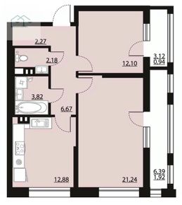 - Жилая площадь: 33.4 м2(площади комнат: 12.1 м2, 21.3 м2);