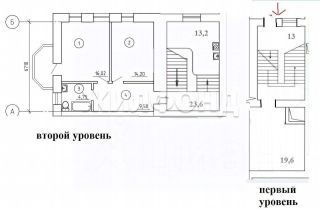 второй уровень квартира 44,6 м2 с двумя комнатами и дополнительно кухня 13,6 м2 с лестничным маршем 23 м2