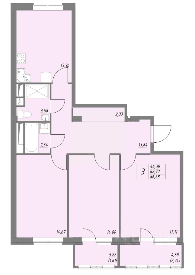 Общая площадь86,68 м²