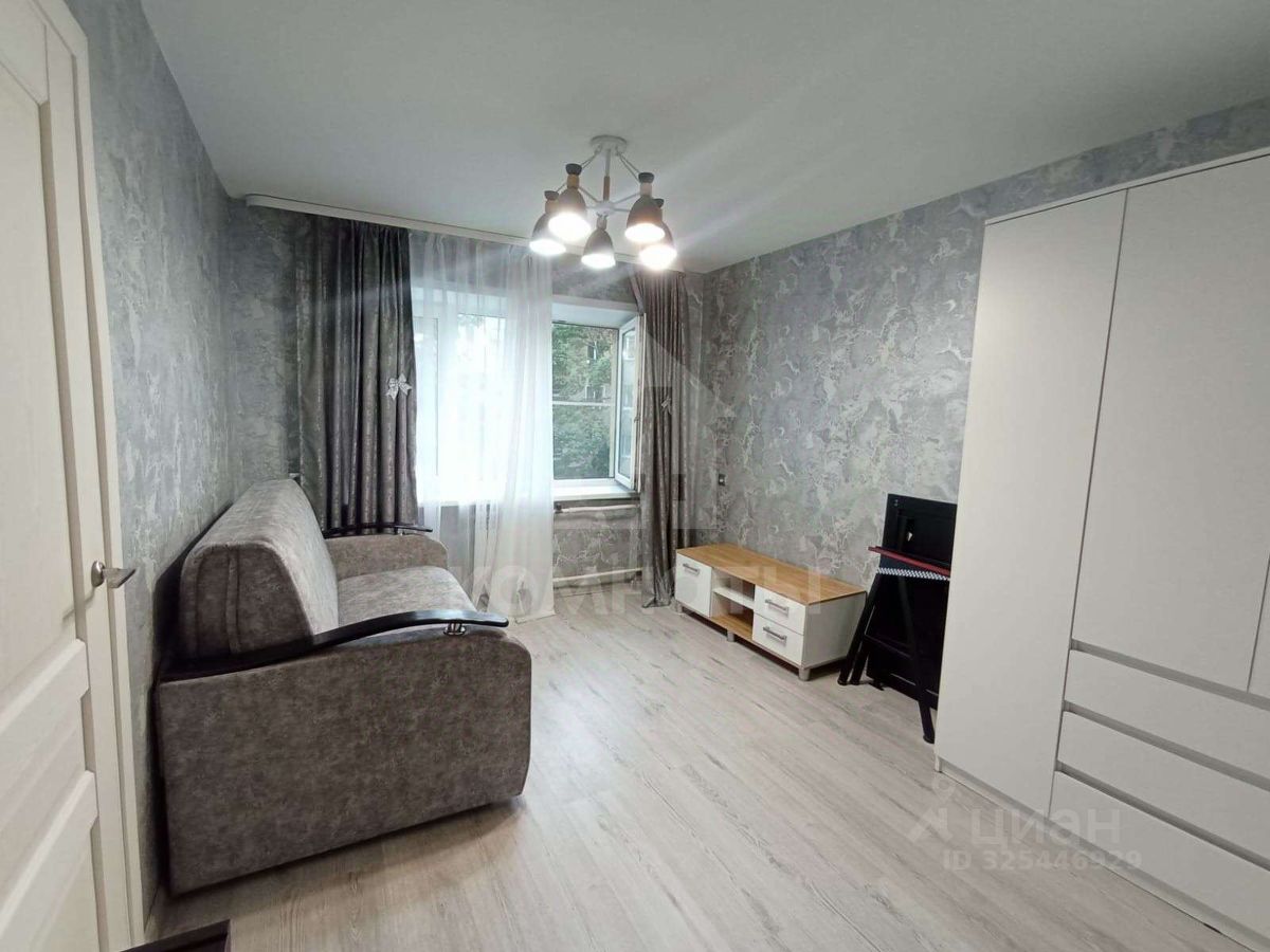 Квартира оснащена мебелью и техникой: кухонный гарнитур, холодильник, микроволновка; в комнате большой диван, шкаф, тумба под телевизор.