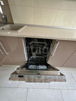 Просторная кухня с гарнитуром, варочной панелью, духовкой, холодильником, посудомоечной машиной и микроволновкой — все остается.