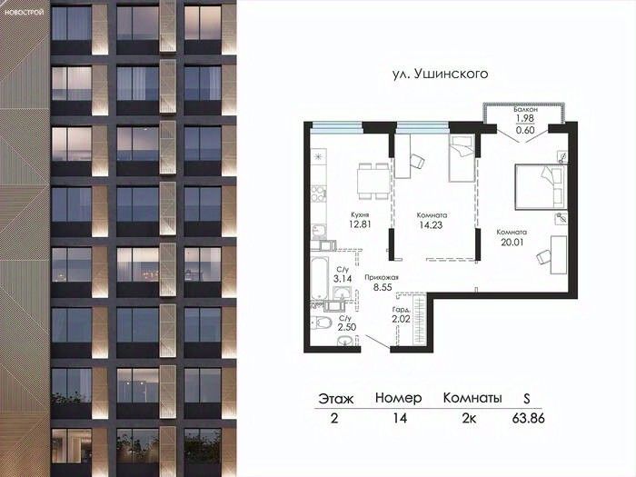 Продаётся 2-комнатная квартира в строящемся доме (Дом 1), срок сдачи: II-кв. 2026, общей площадью 63.86 кв.м., на 7 этаже. Новый жилой комплекс "Glinki парк" от группы компаний "Новострой" расположен по адресу: г. Воронеж, по ул. Ломоносова.