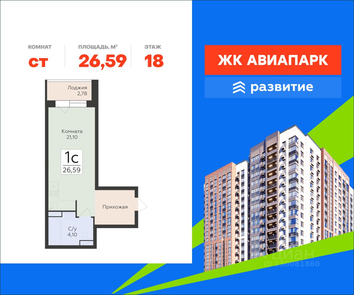 В продаже квартира площадью 26.59 кв. м с черновой отделкой. Квартира расположена на 18 этаже 19 этажного дома, в новом жилом квартале "Авиапарк".