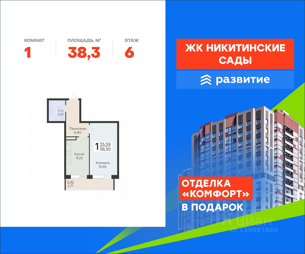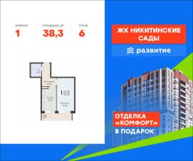 В продаже квартира площадью 38.30 кв. м с черновой отделкой. Квартира расположена на 6 этаже 20 этажного дома, в жилом комплексе комфорт-класса "Никитинские сады".
