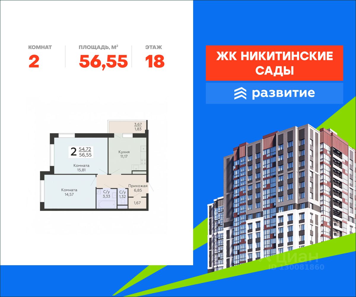 В продаже квартира площадью 56.55 кв. м с черновой отделкой. Квартира расположена на 18 этаже 20 этажного дома, в жилом комплексе комфорт-класса "Никитинские сады".