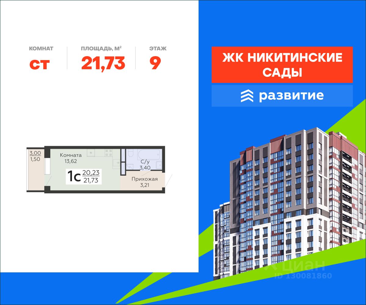 В продаже квартира площадью 21.73 кв. м с черновой отделкой. Квартира расположена на 9 этаже 20 этажного дома, в жилом комплексе комфорт-класса "Никитинские сады".