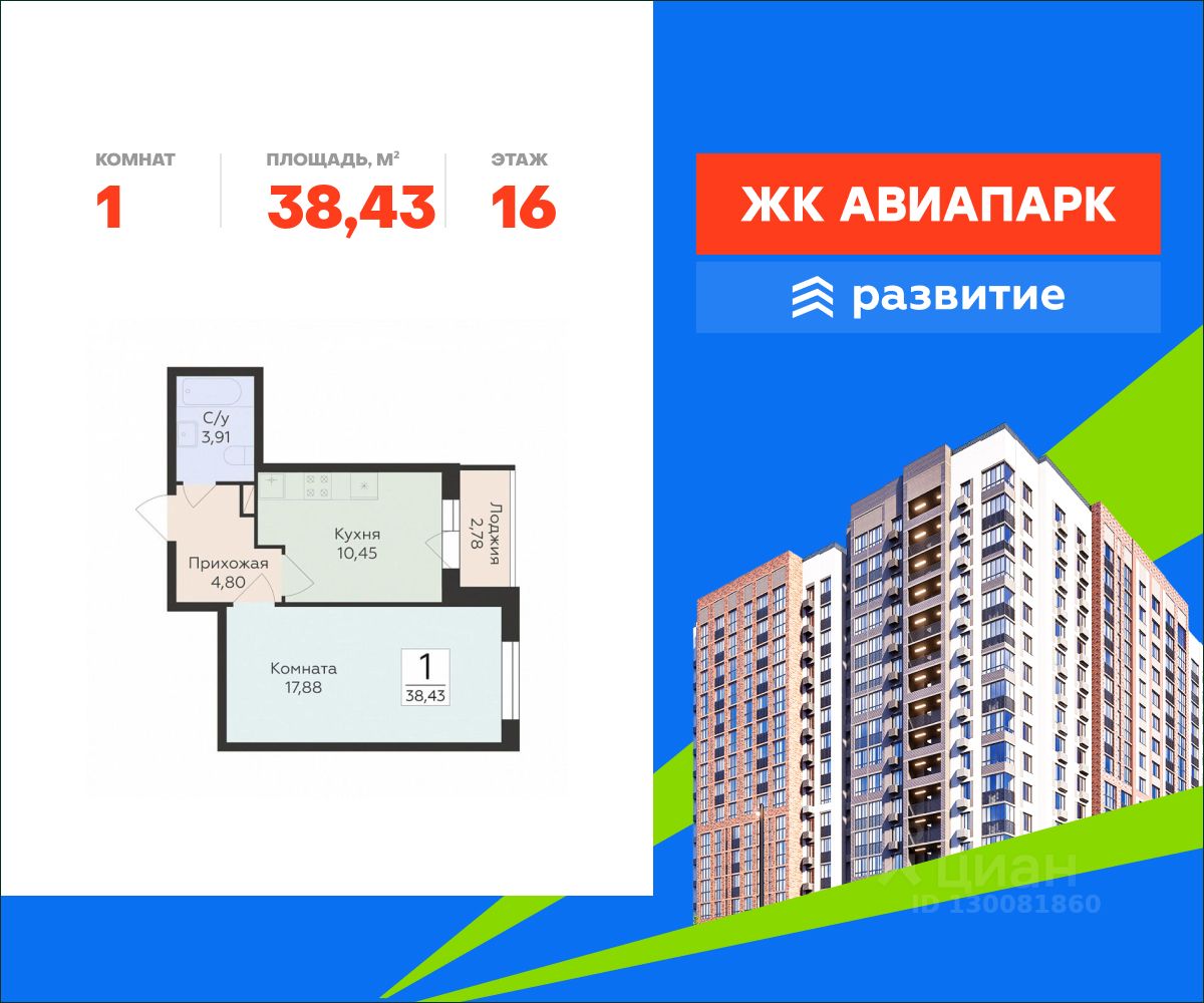 В продаже квартира площадью 38.43 кв. м с отделкой. Квартира расположена на 16 этаже 18 этажного дома, в новом жилом квартале "Авиапарк".