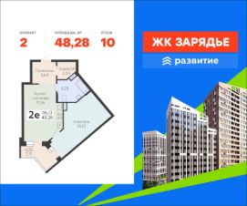 В продаже квартира площадью 48.28 кв. м с черновой отделкой. Квартира расположена на 10 этаже 18 этажного дома, в новом микрорайоне комфорт-класса "Зарядье" (Девелопер - федеральный застройщик ГК "Развитие").