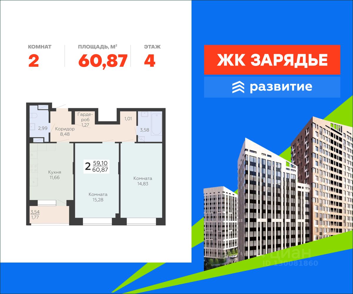 В продаже квартира площадью 60.87 кв. м с черновой отделкой. Квартира расположена на 4 этаже 13 этажного дома, в новом микрорайоне комфорт-класса "Зарядье" (Девелопер - федеральный застройщик ГК "Развитие").