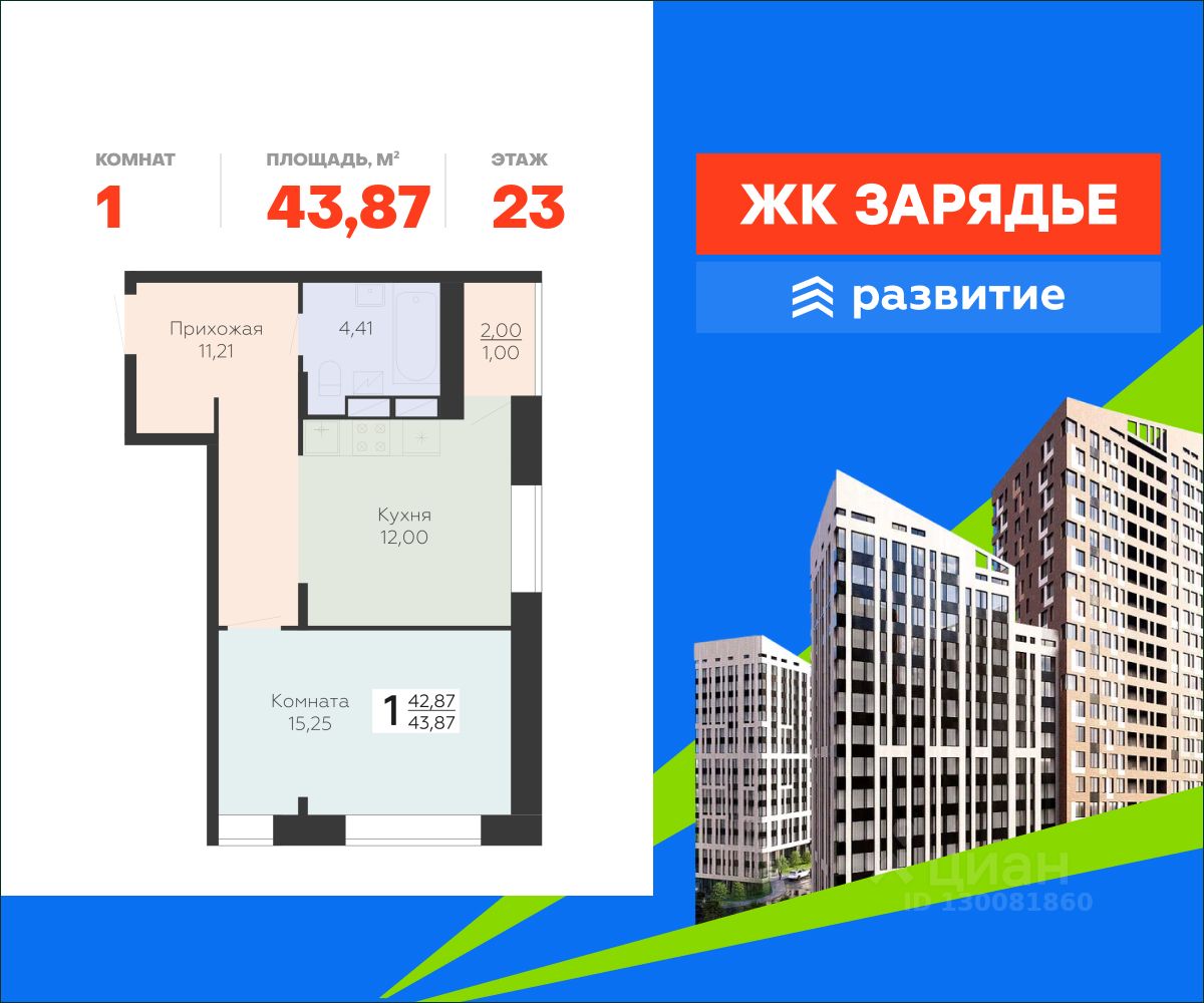 В продаже квартира площадью 43.87 кв. м с отделкой. Квартира расположена на 23 этаже 24 этажного дома, в новом микрорайоне комфорт-класса "Зарядье" (Девелопер - федеральный застройщик ГК "Развитие").