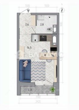 Общая площадь - 21,1 кв.м