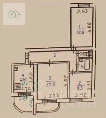 Площадь жилых комнат — 17 м²,12.8 м², 9.3 м²;