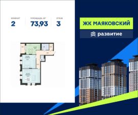 В продаже квартира площадью 73.93 кв. м с черновой отделкой. Квартира расположена на 3 этаже 21 этажного дома, в жилом комплексе "Маяковский" от федерального застройщика ГК "Развитие".