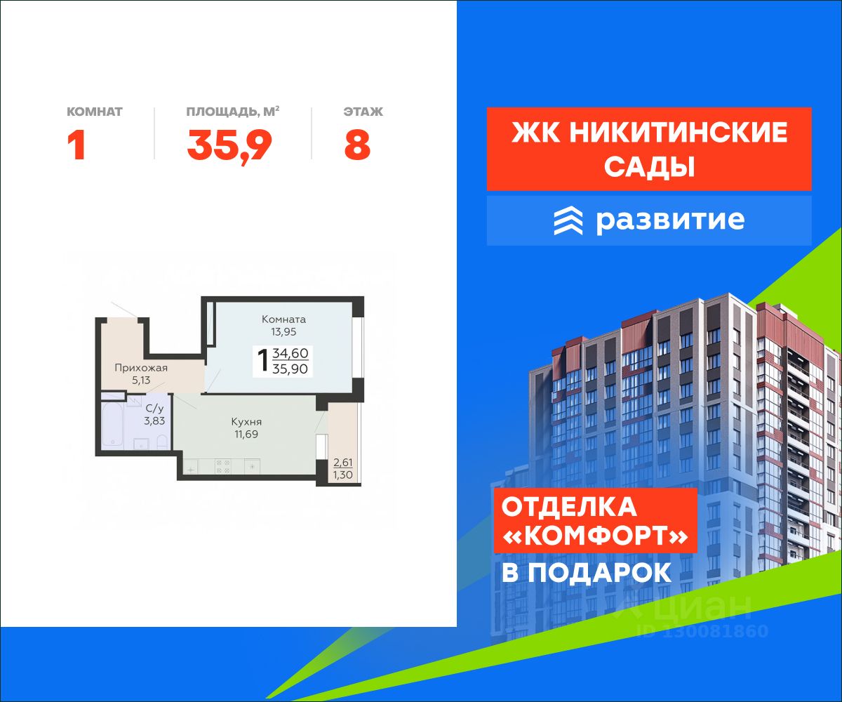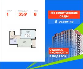 В продаже квартира площадью 35.90 кв. м с черновой отделкой. Квартира расположена на 8 этаже 20 этажного дома, в жилом комплексе комфорт-класса "Никитинские сады".