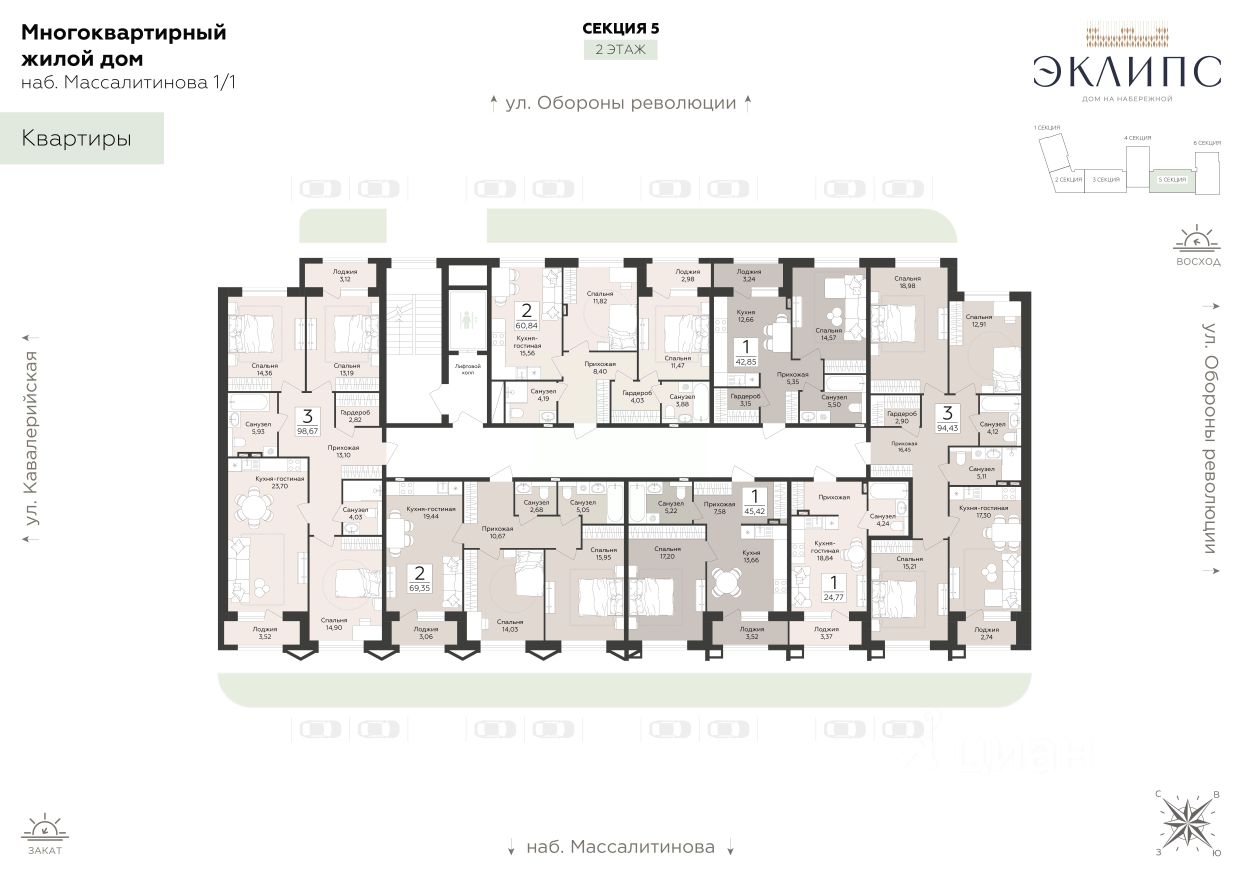 Продаётся студия в строящемся доме (Эклипс), срок сдачи: III-кв. 2030, общей площадью 24.77 кв.м., на 2 этаже. Новый жилой комплекс от группы компаний "Развитие" расположен по адресу: г. Воронеж, набережная Массалитинова.