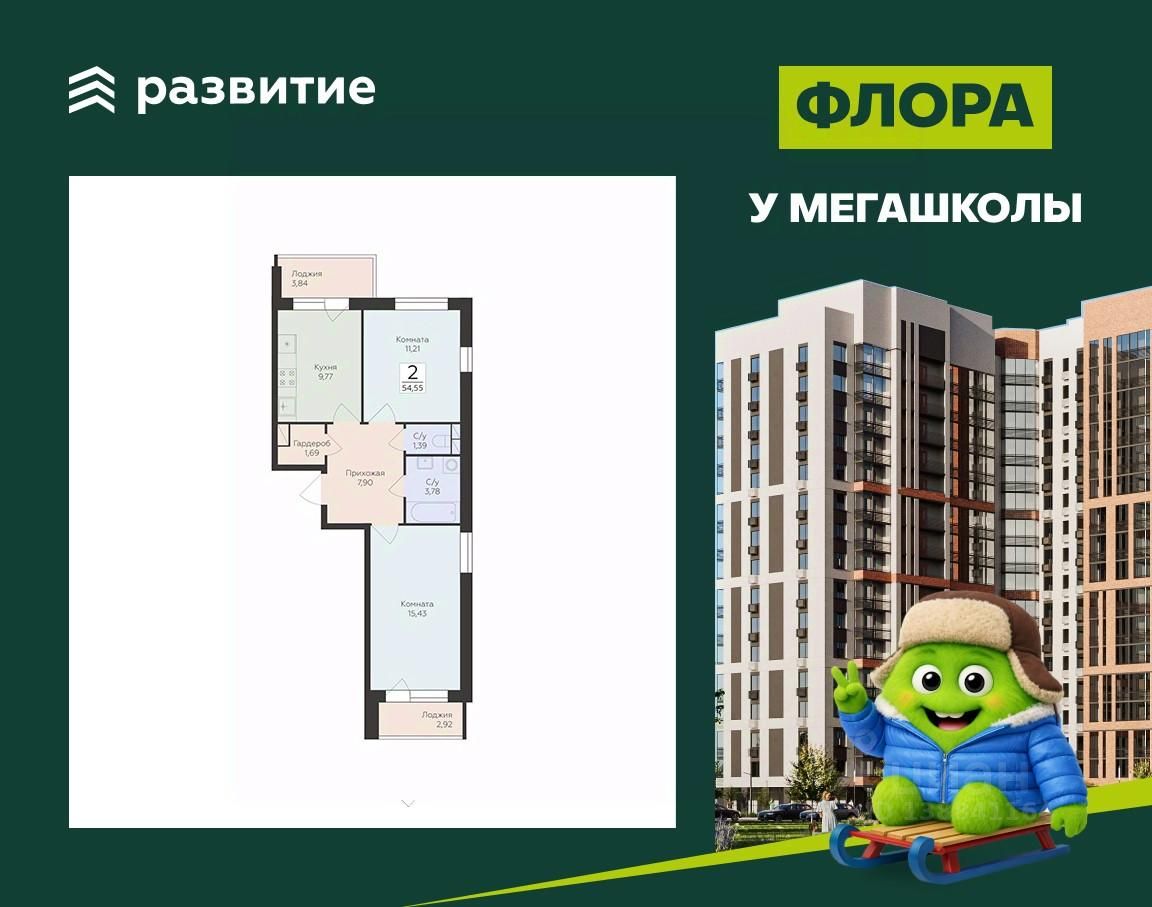 Продается 2-комнатная квартира 54,55 кв.м. на 4 этаже. Скидки до 11%, семейная ипотека, рассрочка 0% до 12 месяцев.
