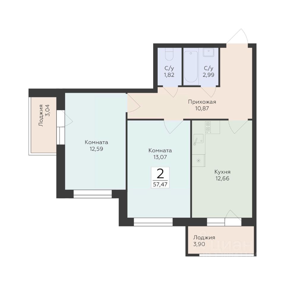 Общая площадь57,47 м²
