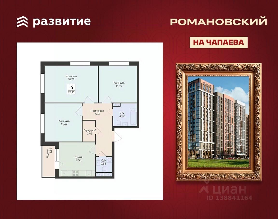 Жилой комплекс "Романовский" - проект класса "комфорт плюс", расположенный на улице Чапаева, в месте, где история встречается с современностью. Соседство с объектом культурного наследия "Водонапорная башня Романовской слободы" делает жилой комплекс воплощением статусности, комфорта и умиротворения. Выбирайте спокойную размеренную жизнь в шумном мегаполисе, не отказываясь от привычных занятий и увлечений. Прогулочный бульвар, стадион для спорта на свежем воздухе, супермаркеты, креативный кластер здесь есть всё, что нужно для полноценной наполненной жизни. Территория двора продумана так, чтобы каждый нашёл здесь занятие по душе. Игровые площадки с безопасным покрытием зонированы по возрасту и создают все условия для игр и общения детей. Современная спортивная площадка с воркаут-зоной поможет поддерживать себя в форме адептам спортивного образа жизни. Планировочные решения квартир спроектированы с учётом современных тенденций и удовлетворяют все потребности будущих жителей. Пространство каждой квартиры продумано до мелочей: • эргономичные студии с зонами для хранения в прихожей; • классические однокомнатные квартиры с гардеробными и большими кухнями; • двухкомнатные квартиры евро-формата с мастер-спальнями гардеробными комнатами; • просторные трёх- и четырёхкомнатные квартиры классического и евро-формата с гостиными, гардеробными и двумя санузлами. В холлах первых этажей спроектированы помещения для колясок и комнаты-лапомойки для ваших питомцев. На каждом этаже ЖК "Романовский" мы предусмотрели кладовые комнаты для хранения сезонных вещей. В проекте будет построен подземный паркинг и наземная парковка на прилегающей территории, рассчитанная на 258 мест. Несмотря на то, что парковка находится в непосредственной близости к подъездам, она не нарушает концепцию двора без машин. Ввод в эксплуатацию запланирован в 4 квартале 2027 года согласно проектной документации. Покупая квартиру в ЖК "Романовский" от ГК Развитие, вы получаете дополнительно БЕСПЛАТНО: - помощь в одобрении и получении ипотеки с минимальной процентной ставкой. - ПОЛНОЕ ЮРИДИЧЕСКОЕ СОПРОВОЖДЕНИЕ сделки купли-продажи - Помощь в реализации МАТЕРИНСКОГО капитала. - Консультация и показ объекта в любое УДОБНОЕ ВРЕМЯ - Помощь в ПОДГОТОВКЕ И СБОРЕ ВСЕХ ДОКУМЕНТОВ, необходимых для покупки.