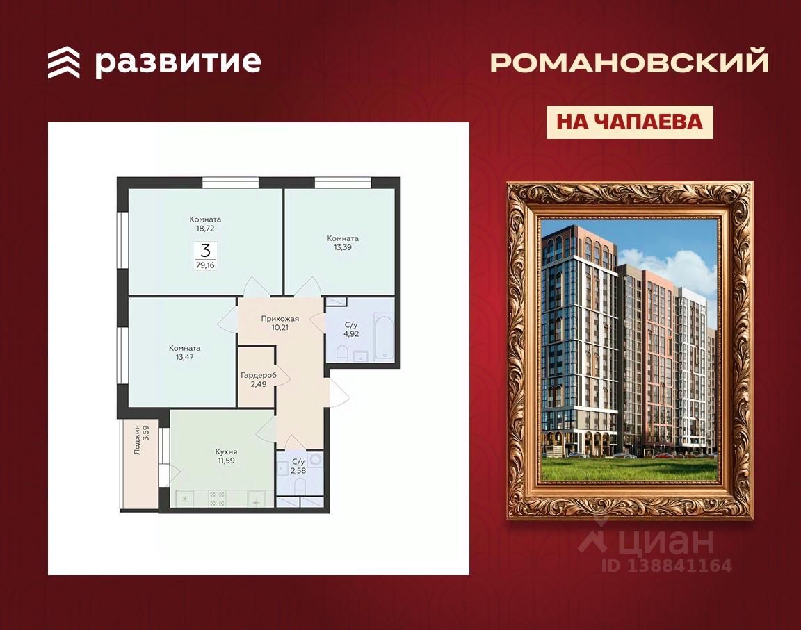 Продается 3-комнатная квартира 79,16 кв.м. на 11 этаже. Жилой комплекс "Романовский" - проект класса "комфорт плюс", расположенный на улице Чапаева, в месте, где история встречается с современностью. Соседство с объектом культурного наследия "Водонапорная башня Романовской слободы" делает жилой комплекс воплощением статусности, комфорта и умиротворения.