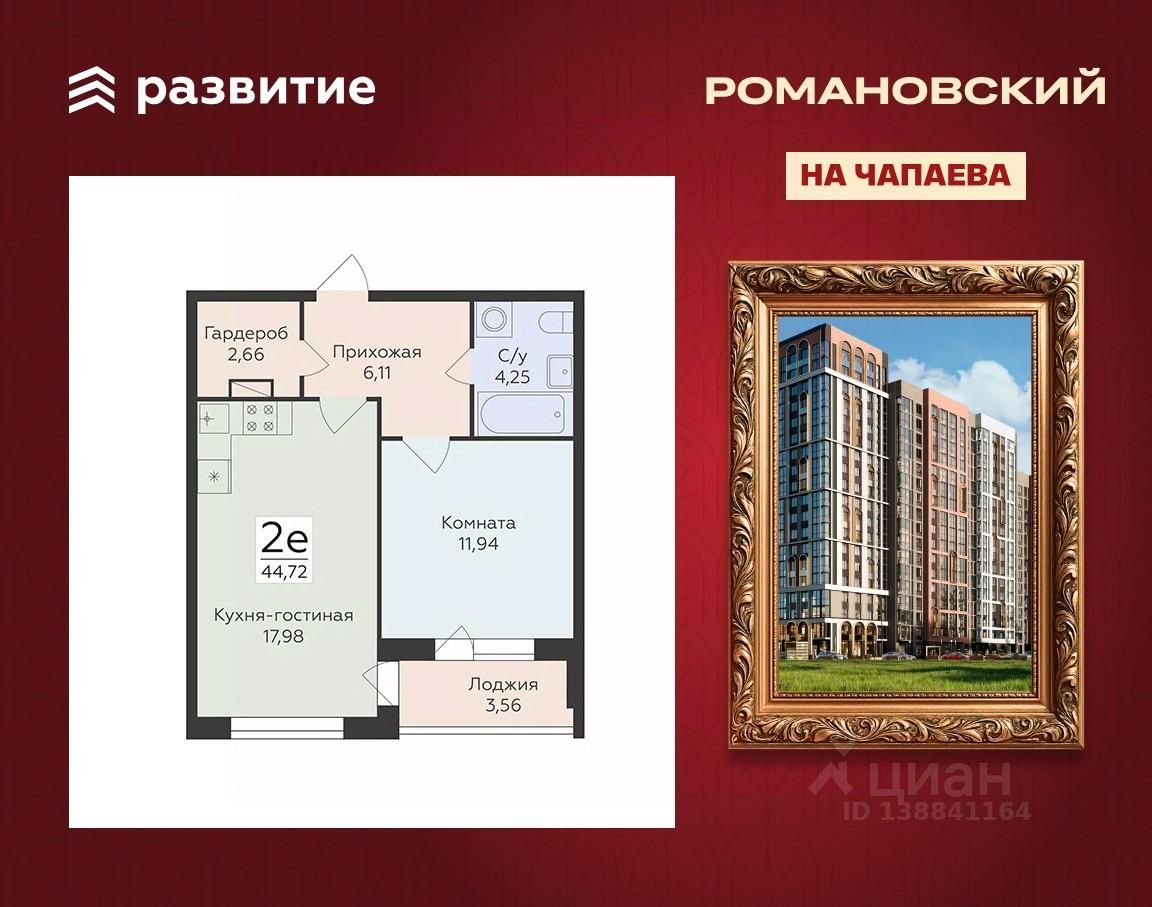 Продается 2-комнатная квартира 44,72 кв.м. на 5 этаже. Жилой комплекс "Романовский" - проект класса "комфорт плюс", расположенный на улице Чапаева, в месте, где история встречается с современностью. Соседство с объектом культурного наследия "Водонапорная башня Романовской слободы" делает жилой комплекс воплощением статусности, комфорта и умиротворения.