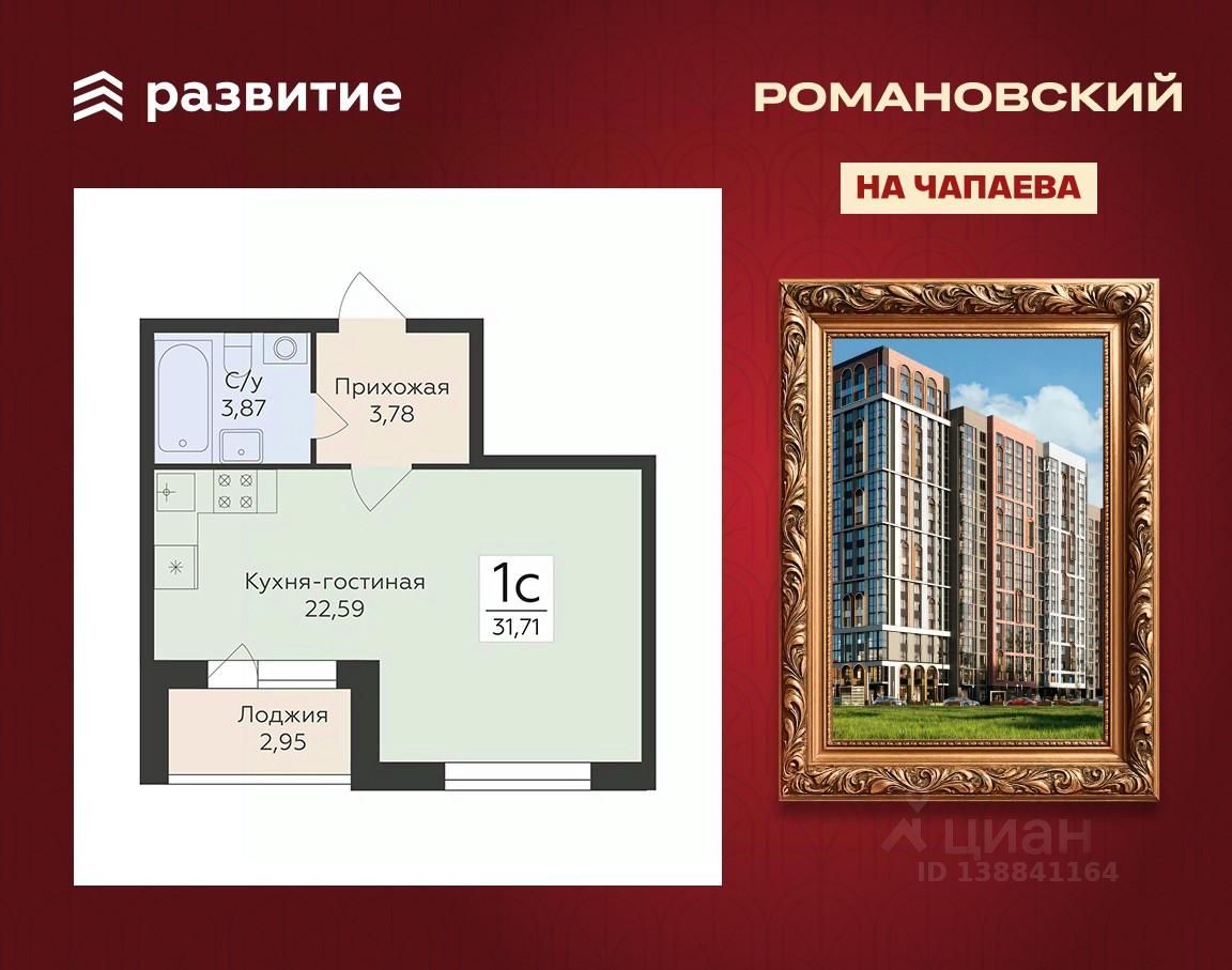 Продается студия 31,71 кв.м. на 5 этаже. Жилой комплекс "Романовский" - проект класса "комфорт плюс", расположенный на улице Чапаева, в месте, где история встречается с современностью. Соседство с объектом культурного наследия "Водонапорная башня Романовской слободы" делает жилой комплекс воплощением статусности, комфорта и умиротворения.