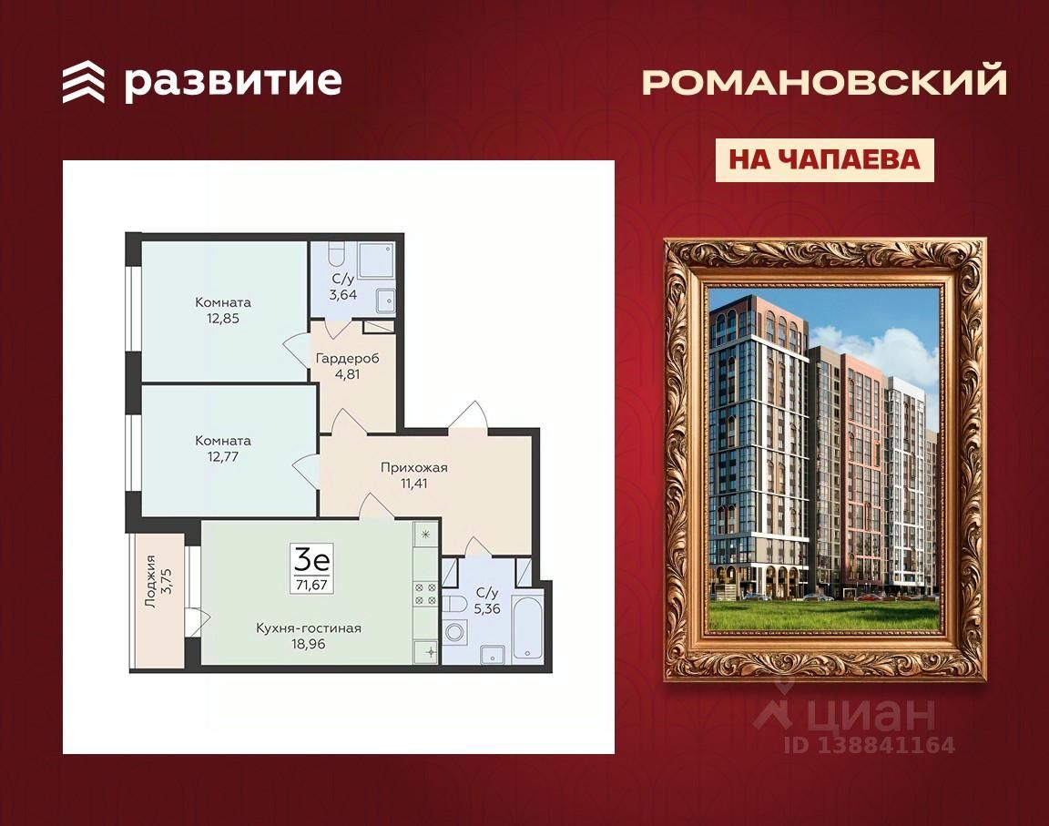 Продается 3-комнатная квартира 71,67 кв.м. на 2 этаже. Жилой комплекс "Романовский" - проект класса "комфорт плюс", расположенный на улице Чапаева, в месте, где история встречается с современностью. Соседство с объектом культурного наследия "Водонапорная башня Романовской слободы" делает жилой комплекс воплощением статусности, комфорта и умиротворения.