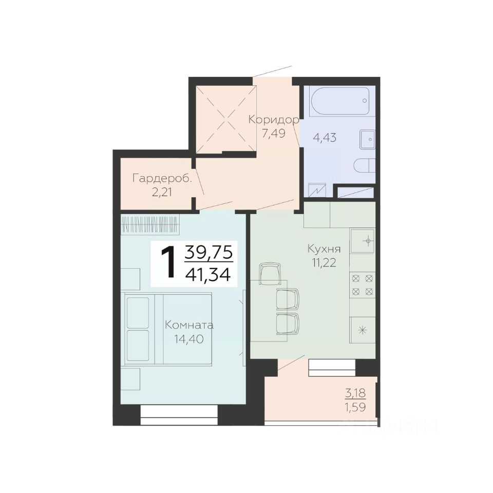Общая площадь41,34 м²