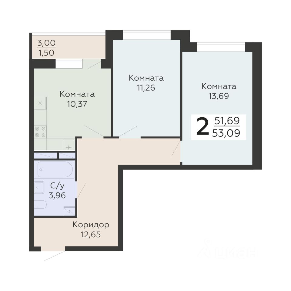 Общая площадь53,09 м²