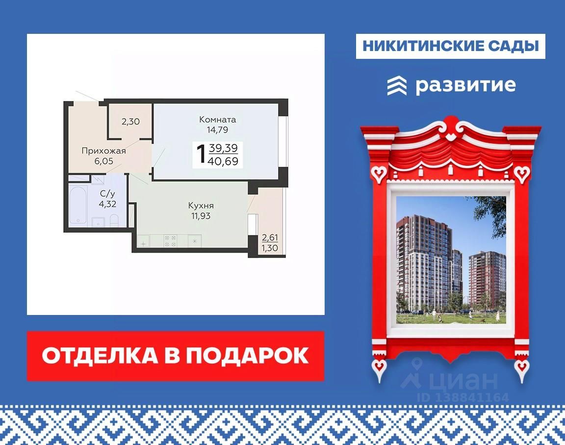 Продается 1-комнатная квартира 40,69 кв.м. на 18 этаже. Жилой Комплекс "Никитинские сады" — это самодостаточный микрорайон, расположенный на тихой территории рядом с крупной городской артерией улицей Антонова-Овсеенко.