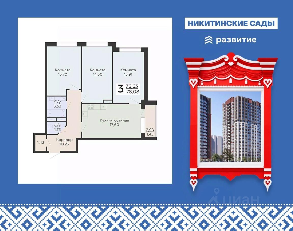 Продается 3-комнатная квартира 78,08 кв.м. на 13 этаже. Жилой Комплекс "Никитинские сады" — это самодостаточный микрорайон, расположенный на тихой территории рядом с крупной городской артерией улицей Антонова-Овсеенко.