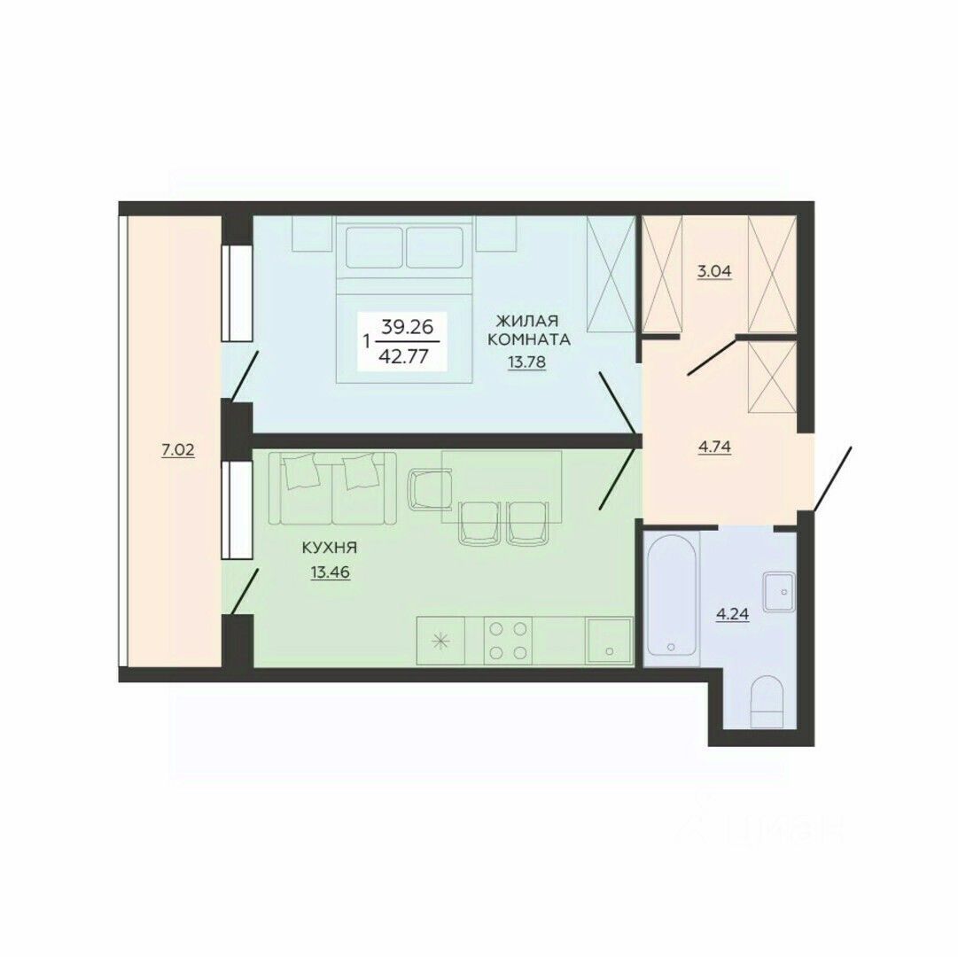 Общая площадь42,77 м²