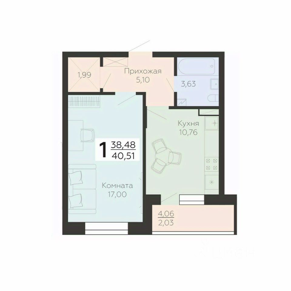 Общая площадь40,51 м²