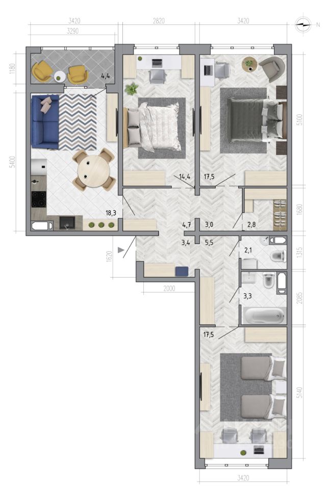 Большая кухня-гостиная, Гардеробная, Спальни на разные стороны.