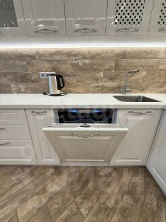 Кухонный гарнитур с каменной столешницей, духовой шкаф, посудомоечная машина, холодильник, СВЧ, чайник, вся необходимая посуда, стиральная машина и отдельно сушильная машинка.