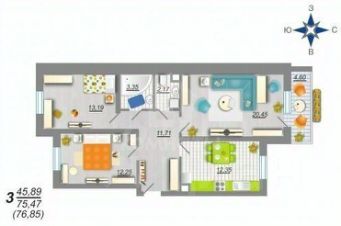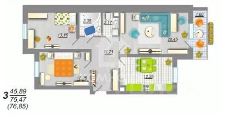 Квартира площадью 76.9 кв.м, из которых: изолированные жилые комнаты - 12.25 кв.м, 13,19 кв.м. и 20.45 кв.м. и кухня - 12.4 кв.м.