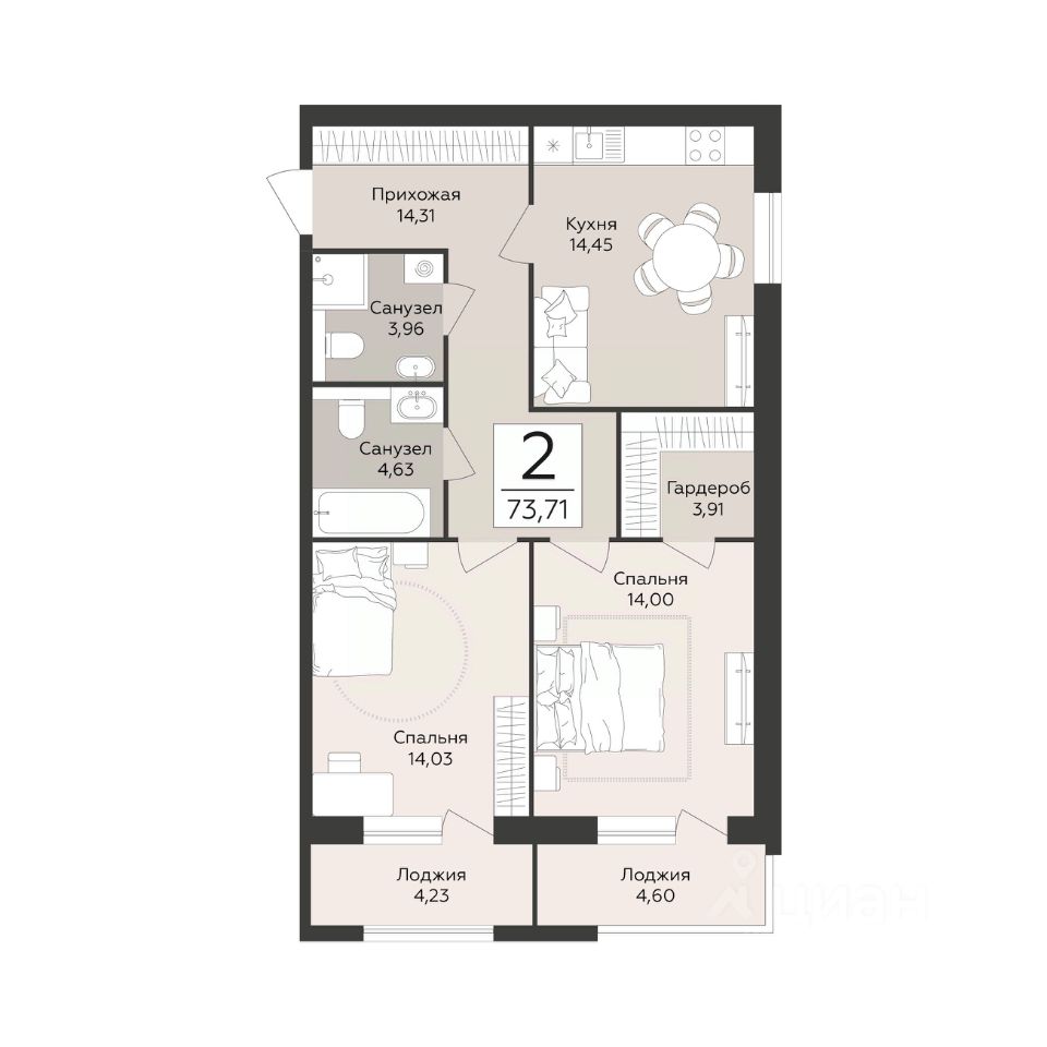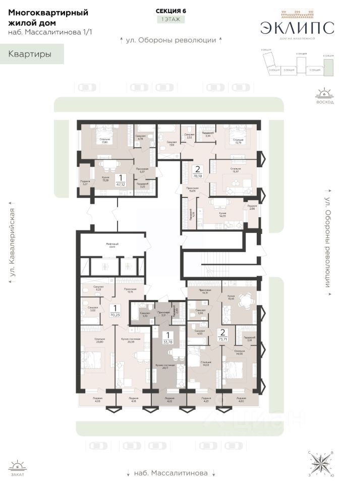 Продаётся 2-комнатная квартира в строящемся доме (Эклипс), срок сдачи: III-кв. 2030, общей площадью 73.71 кв.м., на 1 этаже. Новый жилой комплекс от группы компаний "Развитие" расположен по адресу: г. Воронеж, набережная Массалитинова.