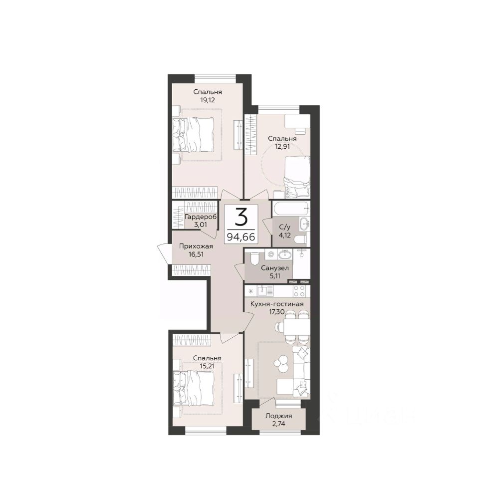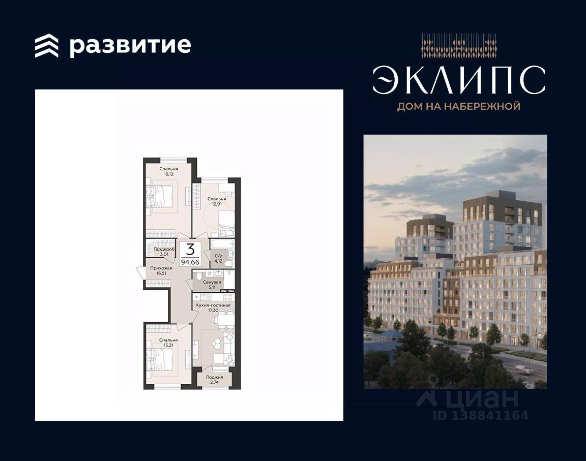 Продаётся 3-комнатная квартира в строящемся доме (Эклипс), срок сдачи: III-кв. 2030, общей площадью 94.66 кв.м., на 4 этаже. Новый жилой комплекс от группы компаний "Развитие" расположен по адресу: г. Воронеж, набережная Массалитинова.