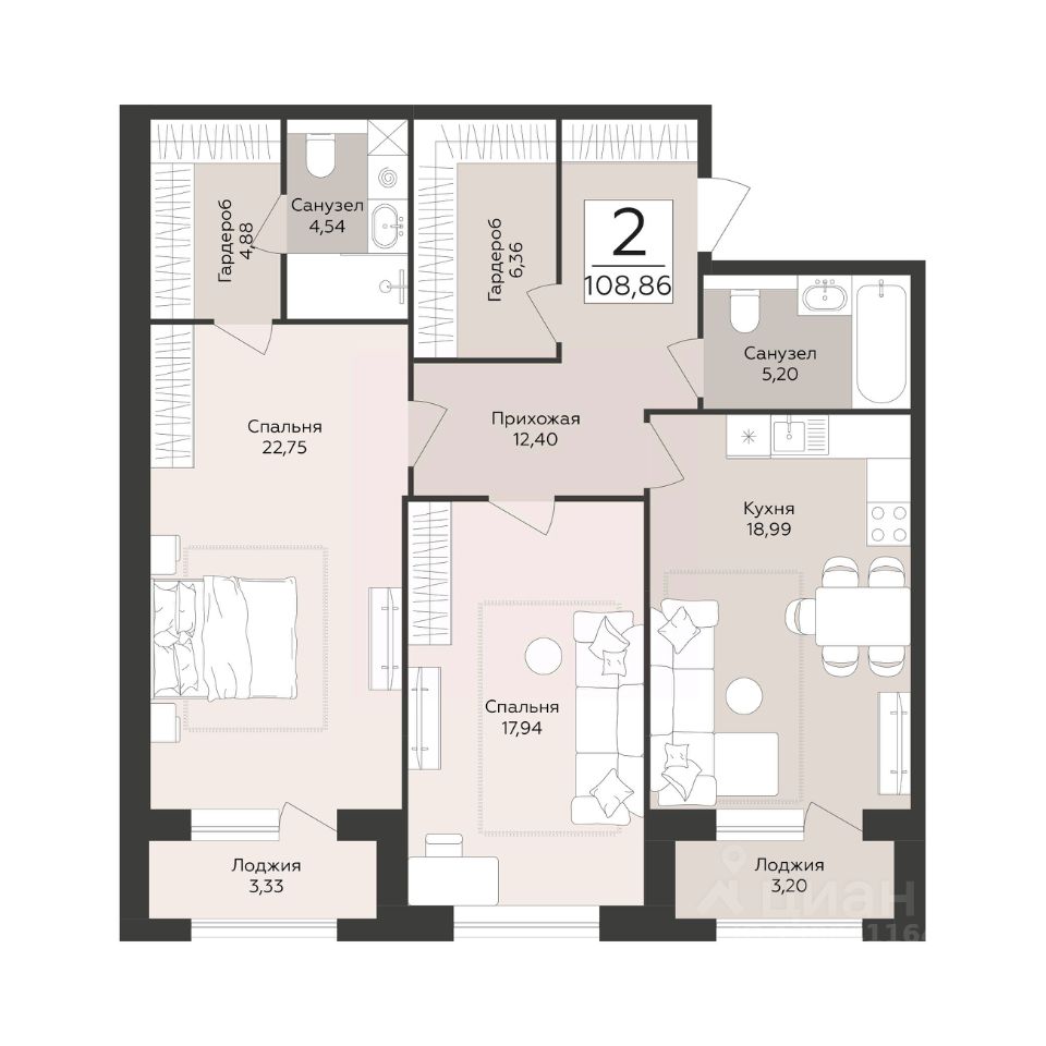 Продаётся 2-комнатная квартира в строящемся доме (Эклипс), срок сдачи: III-кв. 2030, общей площадью 108.86 кв.м., на 1 этаже. Новый жилой комплекс от группы компаний "Развитие" расположен по адресу: г. Воронеж, набережная Массалитинова.
