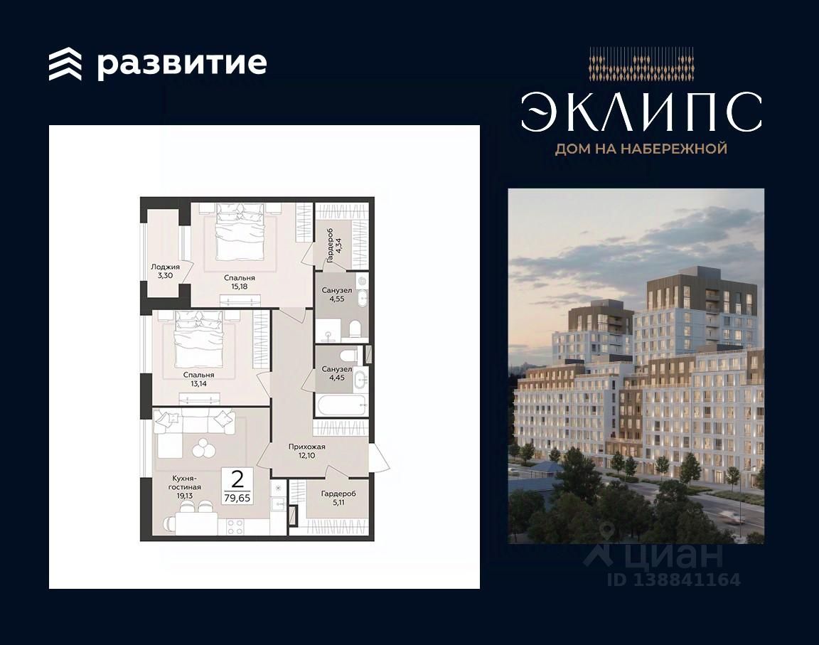 Продаётся 2-комнатная квартира в строящемся доме (Эклипс), срок сдачи: III-кв. 2030, общей площадью 79.65 кв.м., на 5 этаже. Новый жилой комплекс от группы компаний "Развитие" расположен по адресу: г. Воронеж, набережная Массалитинова.