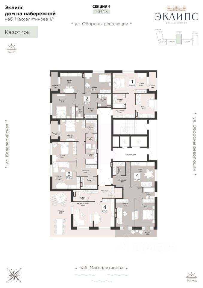 Продаётся 4-комнатная квартира в строящемся доме (Эклипс), срок сдачи: III-кв. 2030, общей площадью 117.42 кв.м., на 11 этаже. Новый жилой комплекс от группы компаний "Развитие" расположен по адресу: г. Воронеж, набережная Массалитинова.