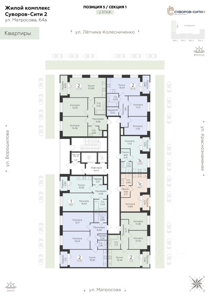 Жилой комплекс "Суворов Сити 2" расположен на ул. Матросова - в районе, стремительно меняющем свой облик. Это идеальная точка баланса между спокойствием тихого района и развитой инфраструктурой. Свободный доступ к главным городским автомагистралям и развязкам позволит быть мобильными и смело прокладывать маршруты в любую точку города - на автомобиле или общественном транспорте. Здесь проходит большое количество маршрутов общественного транспорта, что обеспечивает комфортный доступ в любую точку города.